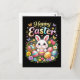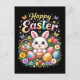 A cheerful pastel bunny surrounded by colorful Easter eggs, spring flowers, and fluttering butterflies sparkles against a magical night backdrop.