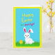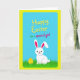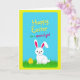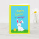 This card shows a spring-themed graphic framed by a bright yellow border around a sky-blue panel with softly rounded corners. Along the bottom third, a band of green grass rises in textured vertical strokes, like a little meadow 🌷. Centered in the scene is a stylized white bunny 🐰 with hot-pink inner ears, round black eyes, and a small pink heart-shaped nose, facing forward with a gentle, friendly look. Tucked into the grass on the bunny’s left sits a decorated oval egg in golden yellow, wrapped with orange wavy stripes, as if it’s been placed there for someone special to find. The main greeting, “Happy Easter,” sits near the top of the blue area in sunshine-yellow lettering. Just below it, the smaller line “for a special girl” appears in a deeper magenta tone, adding a soft, affectionate note to the layout. The colors stay bright and simple, with clear shapes and even lighting that keeps every detail easy to see. The bunny’s pink ears stand out against the blue background, while the yellow-and-orange egg peeks from the green grass at the lower left.