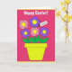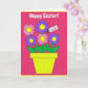 Designed with a flat, graphic look, this card centers on a cluster of five rounded flowers arranged snugly in a bright yellow pot, like a small bouquet offered with friendly affection 🌷. The blooms alternate between soft fuchsia and deep violet, each outlined in black with a sunny yellow circle at the center and a tiny white highlight that makes them feel lively. Green stems and simple leaves rise from the pot, giving the arrangement a tidy, garden-fresh base. Behind everything sits a hot pink background that makes the flowers stand out, like they’re being presented on a cheerful stage. A small white rectangular tag hangs from one violet flower, held by a curled black clip, and the tag reads “Teacher,” adding a thoughtful, appreciative touch. Across the top, “Happy Easter!” appears in rounded white letters, spaced clearly above the bouquet, with 🐰 tucked in as a light accent to the spring theme. A yellow border frames the scene with scattered spot-like shapes that add extra texture around the edges.