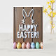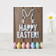 This design shows a tall, portrait-style scene set on warm brown wooden planks with visible grain and vertical lines. Near the top, a simple white line drawing of a long-eared bunny 🐇 sits lightly against the rustic background, giving the layout a gentle, friendly tone. Just below it, the words “HAPPY EASTER!” appear centered in large white all-caps letters, standing out clearly against the wood. A faint shadow under the letters makes the message look slightly raised, like it’s hovering above the surface. Along the bottom edge, a neat row of decorated egg shapes forms a border, arranged close together like they’re sharing space in a cozy lineup 🌷. The eggs are painted in soft pastel pink, sunny yellow, and mint green, and the patterns include blue-and-white stripes, orange swirls, and small polka dots that feel like little gestures exchanged between friends. The lighting is even and soft, bringing out the texture of the wood and the brushed paint details. The lower border shows multiple pastel eggs with mixed patterns lined up tightly across the full width of the card.