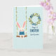This design shows a sweet illustrated bunny sitting on a wooden swing against a light blue background, with a tender little smile that feels like it’s meant for someone close 🐰. The bunny has soft white fur, pink-lined ears, rosy cheeks, and wears a blue tunic with narrow horizontal stripes, giving it a gentle, friendly look. The swing hangs from two rope lines, and the ropes are wrapped with small white and yellow flowers and thin green vines, like a spring garland. Off to the upper right, a round floral wreath adds a romantic, caring touch, mixing blue, white, and yellow blooms with leafy green sprigs 🌷. Inside the wreath, the text “Happy 1st EASTER” sits prominently in blue near the top, with “Great Grandson” placed beneath it in a flowing, cursive-style blue lettering. A faint pale-blue grid pattern spans the background, adding light texture without distracting from the main scene. The wreath’s circular shape and the swing’s curved seat stand out against the soft grid, with blossoms clustered along the ropes and around the wreath edge.