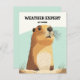 This greeting card features a groundhog with the caption Weather Expert at Work. The illustration has a clean, modern look with simple shapes and a calm color palette, giving the design a slightly more serious and thoughtful tone while keeping the humor subtle. It’s a quiet visual joke that plays on the idea of seasonal forecasting without exaggeration or loud punchlines.