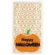 En festiv Happy halloween-pumpa sitter i en anpassningsbar som är digitalt designad mönster av direktuppspelade abstraktens pinhjulformer.