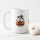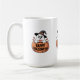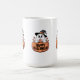 Happy halloween-koffeine Ghost Coffee Mugg. Inuti en gigantisk pumpa, ett spökkaffe under den krokade häxhatten. Boo-hoo? Det är mer som en korv, det är gigglar, skummustasch glöder. Happy halloween, koffeinvänner är vakna!