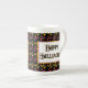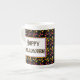 Ett mugg med Halloween mönster i orange, gult och lila candy corn med Happy halloween i gotisk brev på svart.