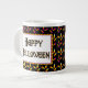 Ett mugg med roligten Halloween mönster av orange, gult och lila candy corn svart med Happy halloween i gotisk brev.