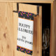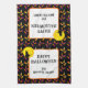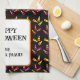 En söt, anpassningsbar Happy halloween kökshandduk med en häxfluga som flyger över fullt på ett färgat mönster i candy corn i gult, orange och måne, med grungande lila.