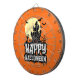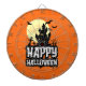 Happy halloween-textillustration med hemsökt hus, kyrkogård och fladdermöss dekoration i fullt måne på grym orange bakgrund
