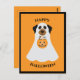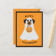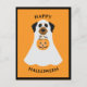 Illustration av en hund klädd som ett spöktrick eller behandling för Halloween.