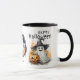 Här är en söt Halloween mugg-för barn som är mer roligt än läskigt. Ett lycklig-spöke bär en svart häxhatt och står bredvid en slipande orange jack eller en lera. Ovanför honom står texten "Happy halloween". Bilden skrivs ut två gånger på mugg, och ett annat lycklig flyter spökbilden mellan dem. Ditt barns namn ligger i grund centrum. Lämplig för barn i alla åldrar.