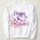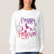hälsning med övertoning av happy halloween med rödhäxa och katt