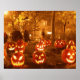 En kvällscen som skildrar en fält-fullt av karvade, orange pumpor som innehåller ett tänt vax-ljus. Pumpen liknar Jack o lantern, som är skrämmande små prydnadsföremål som är traditionella för halloween. Bild ligger i ett grannskap på natten, ofta där folk lurar att behandla på kvällen.