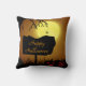 En silhuettillustration av Halloween med ett skrämmande svart landskap med träd och en spindel framför måne, ett tecken med Happy halloween hälsning och två skrattande jack-o-lanternpumpor, allt på en orange-brun nattbakgrund.