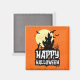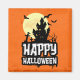 Happy halloween-textillustration med hemsökt hus, kyrkogård och fladdermöss dekoration i fullt måne på grym orange bakgrund