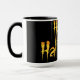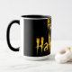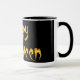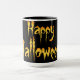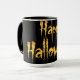Coola tittar orange och gult Happy halloween på svart bakgrund. Roligt och dekorativt kaffe kopp för att fira helgdag.