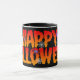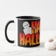 Det här är en söt Halloween mugg med en grafik med ord "Happy halloween" och en mummi, spindlar, spindelnät och en häxhatt på en svart bakgrund.