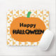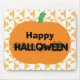 En festiv Happy halloween-pumpa sitter i en anpassningsbar som är digitalt designad mönster av direktuppspelade abstraktens pinhjulformer.