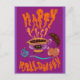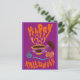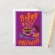 Ursprunglig illustration av en kattälskare i kopp av kaffe med giftig potion, häxa fladdermus, pumpa, magiskt trollspö och lite spöken med handskrift som säger Happy halloween. I orange och lila var djärva maximalister stil och färg.
