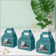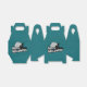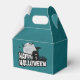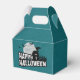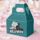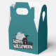 Happy halloween-textillustration med kyrkogård och fladdermöss dekoration vid fullt måne på grinige blue-bakgrund
