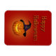Happy halloween illustration med en jack-o-lantern-pumpa med en häxhatt och "Happy halloween" skriven med brev med ben mot röd bakgrund.