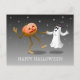 Ett sött Happy halloween-vykort med en pumpkin och ett spöke som har börjat dräpa party och börjat dansa.