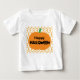 En festiv Happy halloween-pumpa sitter i en anpassningsbar som är digitalt designad mönster av direktuppspelade abstraktens pinhjulformer.