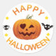 Cute Halloween-pumpen är placerad i cirkeln av Happy halloween och en söt spindel, fladdermus och stjärnor. Detta är en digital illustration.