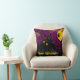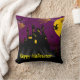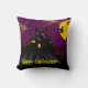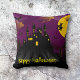 Halloween-kudden med hemsökt slott, en häxa som flyger till måne och fladdermöss runt slottet med anpassadet Happy halloween vid grund. Baksidan är ren svart.
