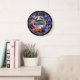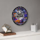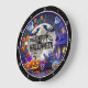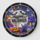 This round wall clock captures a classic Halloween night scene with a full moon, bats, and friendly ghosts floating around. Below, glowing jack-o'-lanterns, a purple haunted house, skulls in a barrel, and whimsical flowers create a spooky yet charming atmosphere. "HAPPY HALLOWEEN" is written in a festive font against the moonlight.