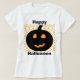 En festiv, leende Happy halloween-pumpa sitter i en anpassningsbar som är digitalt designad mönster av direktuppspelade abstraktens pinjeformer.