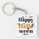 Happy halloween-typografi med nyckelkedjan vintage inslag. Det visningar texten "Happy halloween" i svart- och orange-typografi, vintage inslag som spindel, häxa, fladdermus, svart katt, halvmåns måne och redigerbart år.