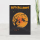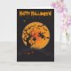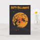 Svart bakgrund med det döda träd som sitter i träd, är en spöklik uggla! Under träd är Halloween pumpor! Ett häxaflyg på henne broomsticken markerar detta spöklika kort som är underbart för en halloween festinbjudan! Happy halloweentext kan redigeras! Text eller fotograferar kan tillfogas till insidan av kortet! Välj upp att matcha porto!