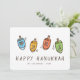 Design is composed of Dreidel spinning top illustration. Add your name, greeting, and year
