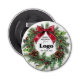 Custom "Happy Holidays" bottle opener for clients with your business logo, a festive wreath, and a red bow. Company promotional supplies for the Holidays, you can order in bulk for your employees or as branding and marketing supplies to promote your store.