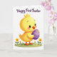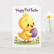 This card features a cheerful, stylized baby bird in buttercup-yellow, shaded to look softly rounded and slightly three-dimensional. Its large dark eyes and rosy cheeks give it a sweet, friendly look, and the open beak reads like a tiny smile meant for someone close. Tucked in its wings is a lavender oval with thin white stripes, held like a small gift shared between friends 🌷. The background stays bright white so the yellow figure and purple accents stand out clearly. Along the bottom, a narrow band of grassy green is sprinkled with small white and sunny yellow flowers, like a simple spring meadow. Near the top, a short commemorative message appears in purple, centered above the character in flowing, connected lettering 🐰. The lavender oval shows delicate white striping, and the green strip below is dotted with tiny blossoms.