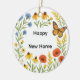 This "new home" ornament presents a vibrant floral wreath design alongside the greeting, "Happy New Home". The reverse side features the message, "A new home, a new beginning, a place where memories grow", along with a personalized date space, transforming it into a meaningful gift and cherished keepsake.