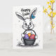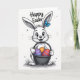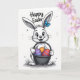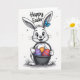 This card shows a friendly, humanlike bunny 🐰 centered on a white background, drawn with soft white fur, wide eyes, and upright ears that give it an attentive, affectionate look. A small light-blue butterfly rests on one ear, adding a gentle touch that feels like a sweet companion stopping by. The bunny holds a dark basket close to its body, as if carrying a little surprise meant for someone special. Inside are three decorated eggs: an orange one with yellow stripes, a purple one with light-blue zigzags, and a red one marked with purple lines. Above the bunny, a short seasonal greeting sits near the top in black, flowing lettering that curves slightly across the open space 🌷. Near the bottom, faint gray strokes suggest early spring grass, and the bunny’s stance feels like it’s leaning forward to share the basket. Light gray speckles are scattered around the background, with a few clustered near the lower edges.