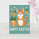 Designed with a sweet spring scene, this card features a stylized cat-like creature with long, pointed ears like a little hare 🐰. Orange stripes wrap its body above a white belly, and its closed eyes, rosy cheeks, and tiny pink tongue give it a tender, friendly look. The background is a muted teal, setting a calm stage that makes the warm orange tones stand out. Around the character, several orange root vegetables appear both singly and in small bundles, their leafy green tops leaning in as if gathered close together. Small white and yellow blossoms are sprinkled across the teal space, and a few white curling flourishes add gentle motion like a breeze through a garden 🌷. The shapes have a layered, cut-paper feel that adds soft depth without looking busy. Along the bottom edge, the words “HAPPY EASTER” sit in large white letters, centered and easy to read. Tiny blossoms and white swirls float near the upper corners against the teal background.