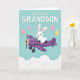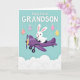 This greeting card shows a long-eared white bunny with rosy cheeks and bright, curious eyes piloting a purple biplane through a light teal sky 🐰. The bunny’s gentle smile and forward-leaning pose give the scene a friendly, caring energy, like it’s flying to meet someone special. A yellow propeller cap sits at the plane’s nose, and dark landing gear adds contrast beneath the rounded body. Soft white clouds drift along the lower third, making the flight feel airy and calm. Near the top, a festive message appears in large white letters, centered and easy to read. From the text, several pastel eggs hang down on thin white strings, like little keepsakes being offered with affection 🌷. The eggs are decorated with small polka dots in pink, lavender, and yellow, spaced evenly for a tidy, springtime look.