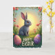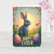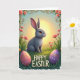 This greeting card shows a soft-furred bunny with long ears and wide eyes, sitting quietly in a lush green meadow 🐰. Warm golden light, like early morning or late evening, washes over the scene as the bunny looks off to the right with a gentle, attentive gaze that suggests it’s watching for a friend nearby. Behind it, the sky fades into a hazy blend of sunny yellow and pale blue, giving the background an airy, tender feel. An ornate frame of curling golden vines wraps the image, dotted with pink daisy-like flowers and smaller blossoms 🌷. In the grass at the front, two decorated eggs rest close together as if placed side by side on purpose—one in soft rose with white and gold patterns, the other in deep violet with matching decorative motifs. The words “HAPPY EASTER” sit at the lower center in large uppercase letters, rendered in a strong dark tone that stands out against the lighter background. The border’s gold lines and the pink flowers form a detailed ring around the bunny, with the two patterned eggs nestled near the bottom edge.