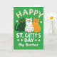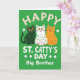 This greeting card shows three stylized cats lined up side by side on a rich emerald green background, their bodies dotted with green polka dots that echo the festive theme 💚. A sleek black cat, a bright white cat, and an orange tabby lean close as if posing together, their yellow eyes turned forward with a friendly, affectionate look. Small white shamrocks float around them like confetti, filling the space without crowding the trio ☘️. Near the top, the word “HAPPY” sits in soft cream letters, centered above their ears. Under the cats, “ST. CATTY’S DAY” appears in matching cream text, arranged as a clear, cheeky headline. At the very bottom, “Big Brother” is written in smaller cream lettering, tucked neatly beneath the main message. The black cat adds a tiny pink tongue peeking out, and all three have little pink smiles against the green field.