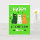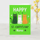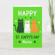 This greeting card features an emerald green background sprinkled with floating shamrocks in white and deeper green, creating a festive St. Patrick’s Day setting ☘️. Three stylized cats stand side by side as the focus, close enough that their shoulders nearly touch, like friends posing for a photo. On the left is a sleek black cat with bright yellow eyes and a tiny orange nose, facing forward with a calm, confident look. In the middle, a white cat is dotted with small green shamrocks, leaning subtly toward its neighbors as if enjoying the company 💚. On the right, a warm orange tabby with gentle stripes wears a small, satisfied smile that feels like a friendly wink to the other two. The word “HAPPY” sits at the top in white sans-serif lettering, while “ST. CATTY’S DAY Nana” appears below the cats in matching white text. Around them, shamrocks of mixed sizes drift across the green field, including both three-leaf and four-leaf shapes.