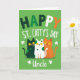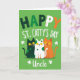 The front design shows three stylized cats posed close together on a lime-green background, their calm faces and slightly tilted heads giving them a cozy, friendly closeness 💚. One cat is deep emerald with lighter green polka dots, the middle cat is white with dark green polka dots, and the third is orange, creating a lively trio against the single-color setting. Above their ears, the words “HAPPY ST. CATTY’S DAY” curve in uppercase lettering, with small shamrocks tucked around the phrase ☘️. Beneath the cats, “Uncle” sits centered in a smaller line, also paired with shamrock accents. The cats look outward with small curved yellow eyes, and their simple shapes and tidy outlines make them feel like a fun little group portrait. A clever detail appears in the word “HAPPY,” where the letters include faint ruler-like tick marks that add texture without crowding the design. The overall layout stays centered and balanced, with the arched headline on top, the trio of cats in the middle, and “Uncle” placed neatly below on the green field. Tiny shamrock icons dot the space near the text, framing the cats against the bright green backdrop.