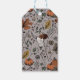 Märkrn i höstpresenten i elegant innehåller handritade illustrationer i svart bläck, med en blommigt ko-skalle på framsidan och en western fallskörd med döskallar, ro, pumpor, höst löv, grenar och bär på baksidan, allt i ett elegant-fall-färg-system. Grått-bakgrund.