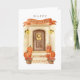 Helgdag-kort för hösthusdockor i happy thanksgiving. Frontdörren dekorerad för hösten. Det här kortet är ett klassiskt vikat kort.