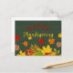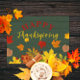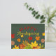 Personligens vykortsutformning med texten "Happy thanksgiving" skriven på gröntens träbakgrund med färgad löv. Texten är helt och hållet anpassade. Om du vill ändra användan väljer du Anpassa. Om du vill ha fler ändringar, t.ex. ändringar i teckensnitt, teckensnitt färg eller textlayout, användor du alternativet Redigera design verktyg.