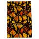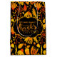 Typografi av happy thanksgiving i orange toner med fallande blad och lövlöst mönster över svart bakgrund. Anpassade-familjen namn
