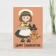 Denna design presenterar en vallfärdaflicka med en kalkon. Ett underbart kort för någon på thanksgiving. TEXTEN kan skräddarsy med ditt egna ordstäv, genom att redigera, boxas till höger.