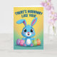 Designed with a sky-blue bunny 🐰 standing front and center, the illustration features an open-mouthed grin, glossy dark eyes, and soft rosy cheeks that make it feel like it’s leaning in for a friendly hug. Pink inner ears and matching paw pads add sweet accents, and the bunny’s open arms suggest an affectionate, welcoming moment. On both sides sit four decorated egg shapes, each filled with a neat grid pattern that feels like a shared springtime tradition between friends. The eggs are colored lavender, rose, leafy green, and warm orange, with small highlights that give them a lightly shiny look. Behind everything, the background fades from sunny yellow at the top into a calm turquoise-green near the bottom, like early morning light across a meadow 🌷. Across the upper area, rounded blue text stretches in a gentle arc, standing out clearly against the yellow portion of the gradient. The bunny’s pink ears frame the top corners while the four grid-pattern eggs line up around its sides in lavender, rose, green, and orange.