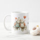 Whimsical love birds decorate this coffee mug. There are two images, one is flipped. Between them is text "Happy Valentine's Day" which can be changed. AI assisted graphic purchased with commercial use. Artwork: RedHeronLighthouse